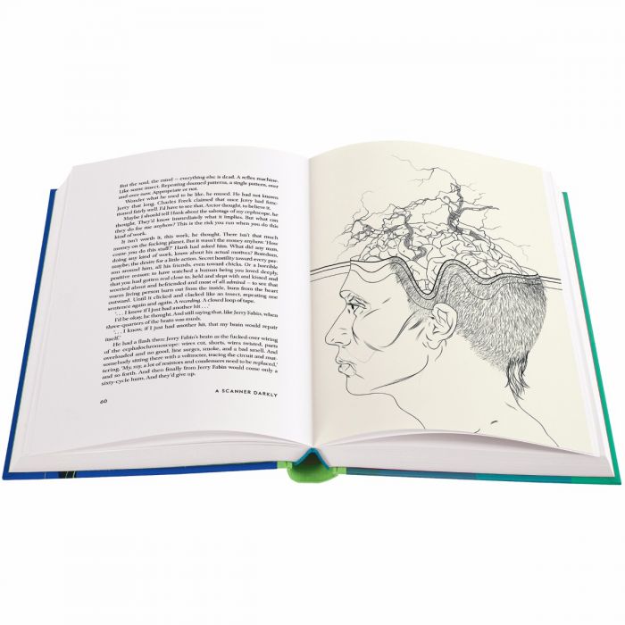 Both novels, written with Dick’s trademark energy and prescience, explore many of the author’s personal obsessions. His twin sister died when only a few weeks old, and his characters often find themselves at odds with ‘phantom twins’ and multiple identities, while his habitual drug use inspired A Scanner Darkly. As he writes in the poignant foreword, included with this edition: ‘I am not a character in this novel; I am the novel.’ In a nod to the tête-bêche binding style popular with early pulp publishers, the two titles are bound upside down relative to each other, and each features a different illustrator. For Androids, Chris Skinner has summoned the seedy neon-drenched noir of Dick’s original vision. Andrew Archer’s images for A Scanner Darkly are appropriately hallucinatory, offering a glimpse of the horrors and the wonders of a bad trip. A unique collaborative double-page illustration at the centre of the book brings these visionary worlds together, creating the ultimate collector’s edition of two science-fiction classics.