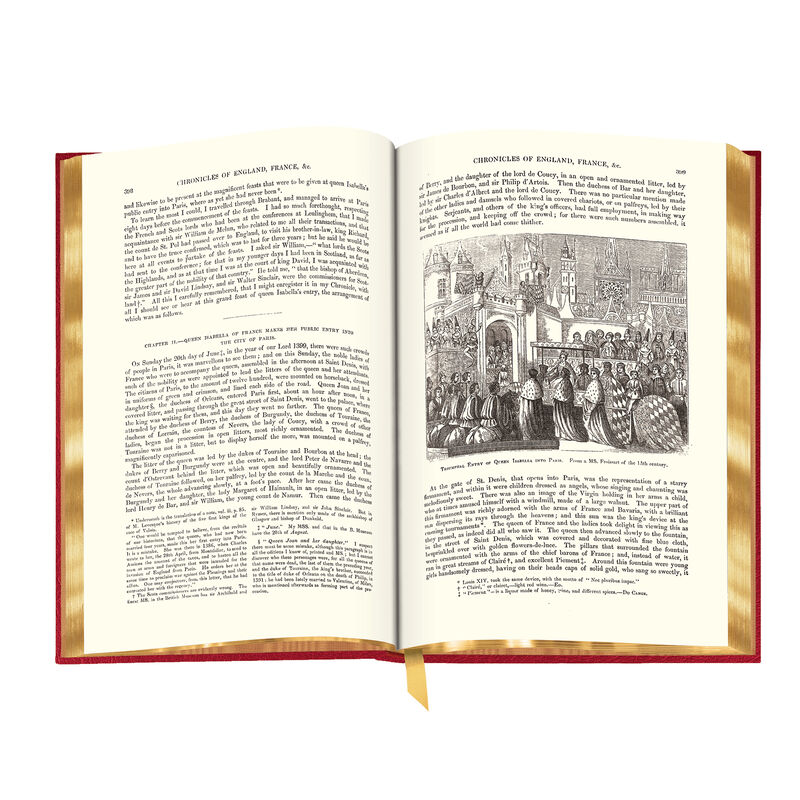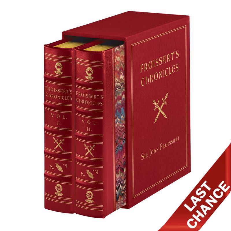 A landmark work from medieval times – Froissart's Chronicles are a key primary source for eyewitness accounts of the Hundred Years' War – the war that forever shaped England and France. The Chronicles remain the most important document detailing the ideals of chivalry and its revival in the 14th century. This two-volume set features 116 woodcuts, 70 full-color images, gold metallic inks, and individually hand-marbled paper on the covers (making each set unique).